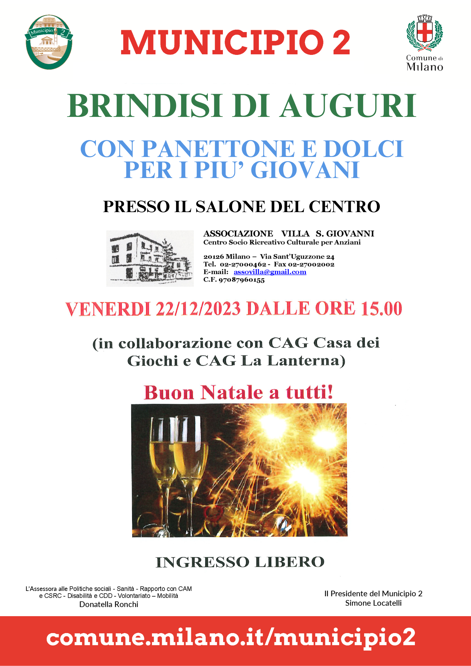 - 22.12.2023 alle 15:00 - Brindisi augurale con panettone e dolci per i più giovani, in collaborazione con i Centri Aggregazione Giovanile Casa dei Giochi e La Lanterna;