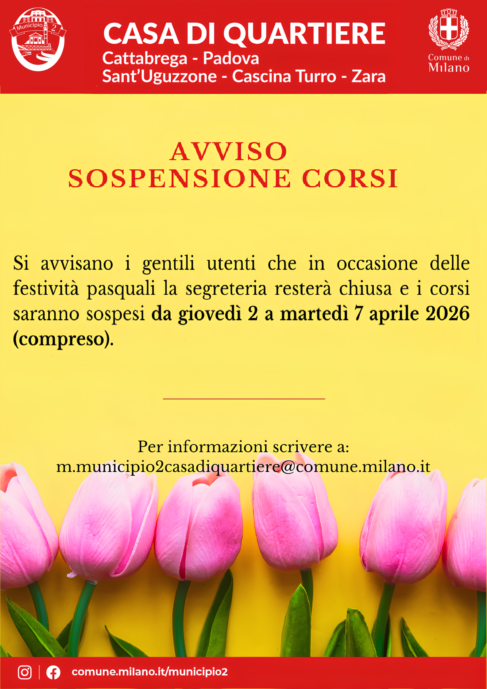In occasione delle prossime festività pasquali, in tutte le Case di Quartiere del Municipio 2, dal 02 al 07 aprile 2026 la Segreteria resterà chiusa e i corsi saranno sospesi.
