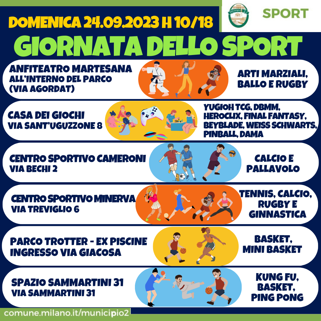 Una grande festa dedicata a chi ama e pratica lo sport, che si svolge contemporaneamente in diverse location del Municipio 2: Anfiteatro Martesana, Casa dei Giochi, Parco Trotter, Spazio Sammartini 31, e nei Centri Sportivi Cameroni e Minerva, nella giornata di domenica 24 settembre 2023 - dalle 10:00 alle 18:00.