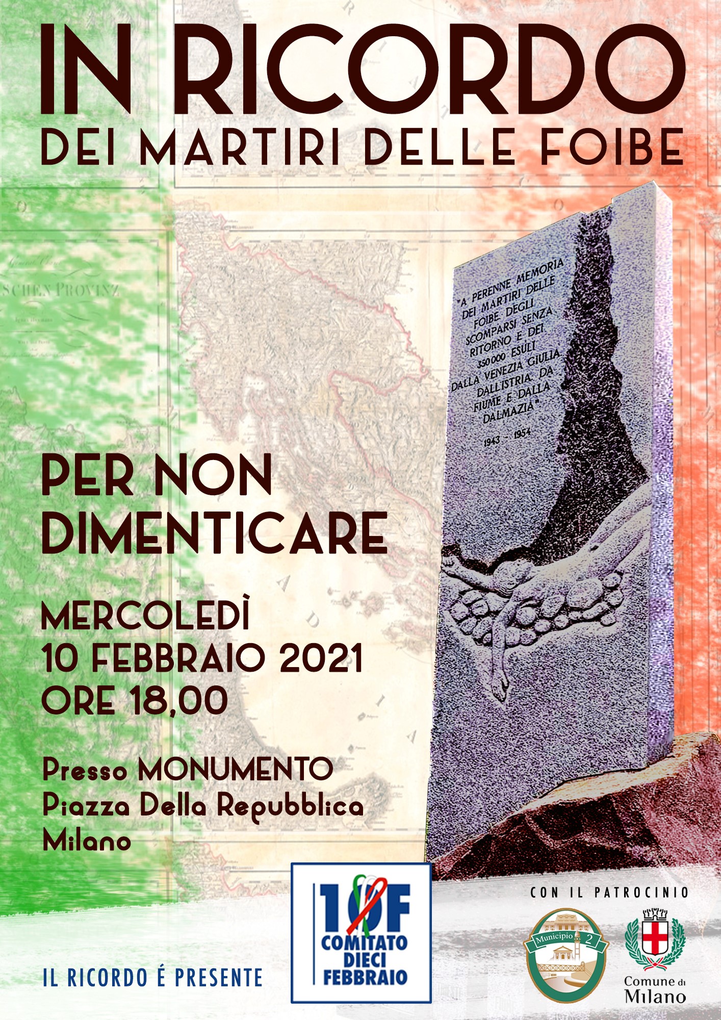 Milano, 8 febbraio 2021 - Si svolgerà mercoledì 10 febbraio 2021 alle ore 18:00, presso il monumento in piazza della Repubblica, la cerimonia commemorativa per i Martiri delle Foibe organizzata dal Comitato 10 febbraio.